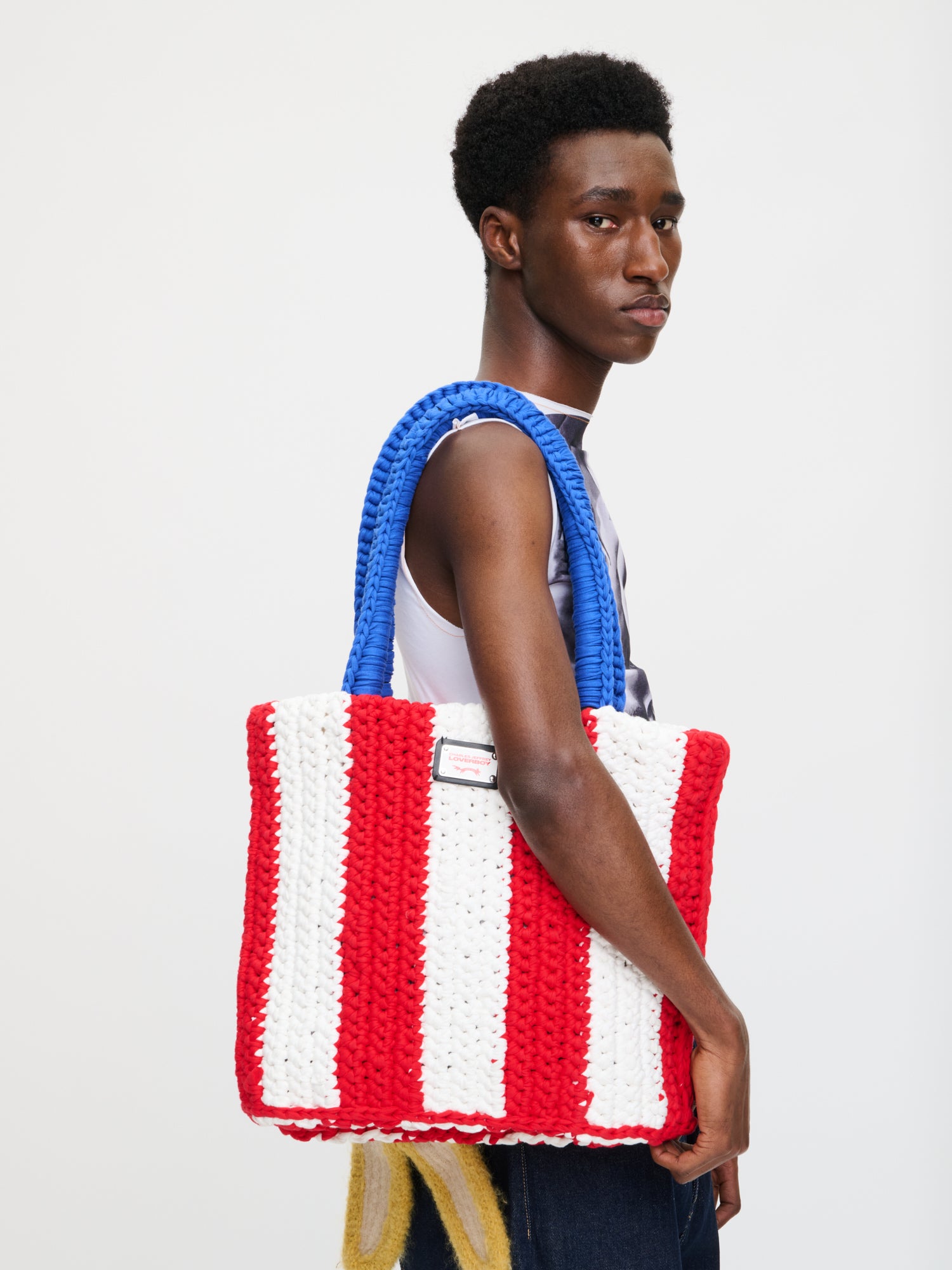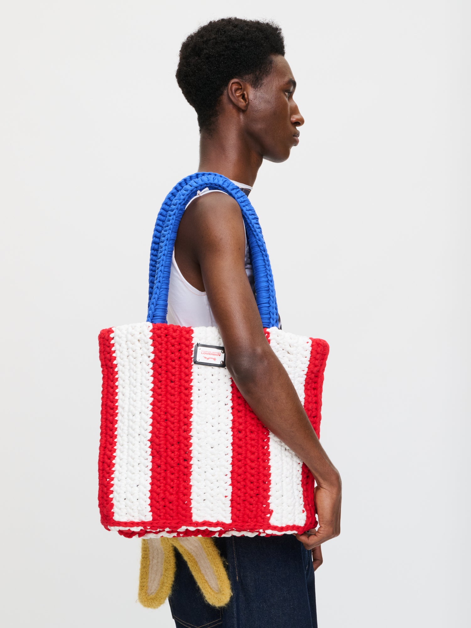Our Mega Bucket Bag is the perfect throw-all-your-possessions-in tote. but it still has that LOVERBOY edge. An homage to our signature chunky knitwear. it is crocheted from pure cotton and slings comfortably over your shoulder.
